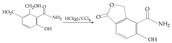 - The major product expected from the reaction is represented by option (C). $−COOH$ group reacts with $−CH_2-OH$ group to form $−COO−CH_2−$, a cyclic ester.HCl(g) acts as catalyst.