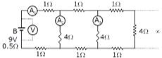 Question: A 9 V battery with internal resistance of $ 0.5\Omega $ is connected across an infinite network as shown in the figure. All ammeters A1, A2, A3 and voltmeter V are ideal. Choose correct statement. [JEE Online 08-04-2017]