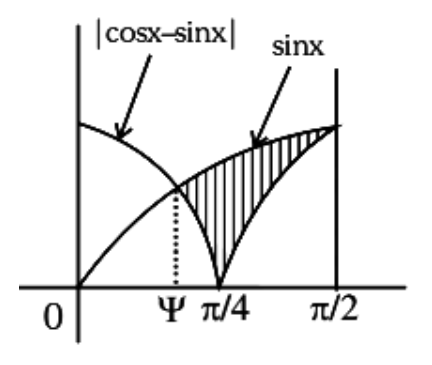 $\begin{aligned} \text{ Area } & =\int _{\psi}^{\pi / 2}(\sin x-|\cos x-\sin x|) d x \\ & =\int _{\psi}^{\pi / 4}(\sin x-(\cos x-\sin x)) d x +\int _{\pi / 4}^{\pi / 2}(\sin x-(\sin x-\cos x)) d x \end{aligned}$
