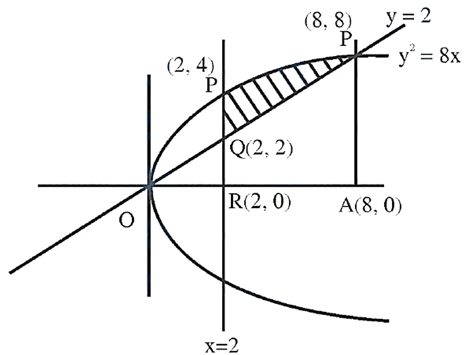 $\therefore$ Area of shaded $ =\int_2^{8}(\sqrt{8 x}-x) d x=\int_2^{8}(2 \sqrt{2} \sqrt{x}-x) d x $